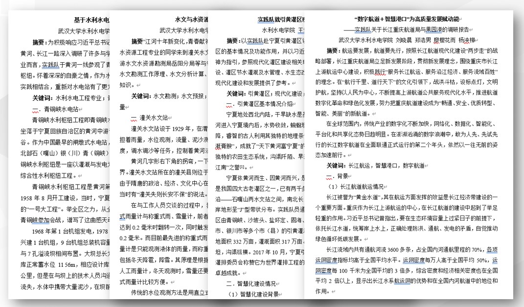 作为学校 “揭榜挂帅”之“十年新变化”专项团队,实践队撰写调研报告15万余字、各地调研总结8篇、专业论文4篇,发放并收回调研问卷千余份,整理实践日志16篇、会议记录19篇、调研心得22篇、访谈实录24篇,制作实践纪实视频6部,拍摄调研照片684张,发表新闻稿81件(次),得到了教育部、光明日报、人民网、中青网、中国水利报等各级各类媒体平台报道,引发社会广泛关注。